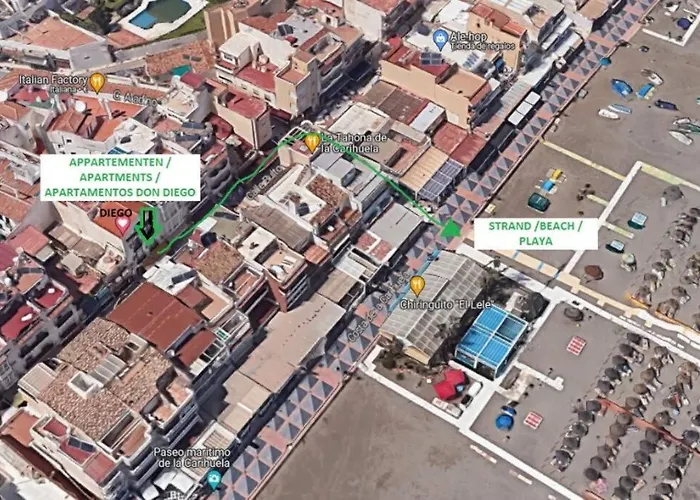 If you want to stay in the Carihuela district of Torremolinos, the beachfront 1-bedroom Precioso Estudio Junto Al Mar, Apartamentos Don Diego En La Carihuela Torremolinos is a good choice located, about 25 minutes' walk from the Plaza del Lido. Guests can use Wi-Fi for either business or leisure reasons.